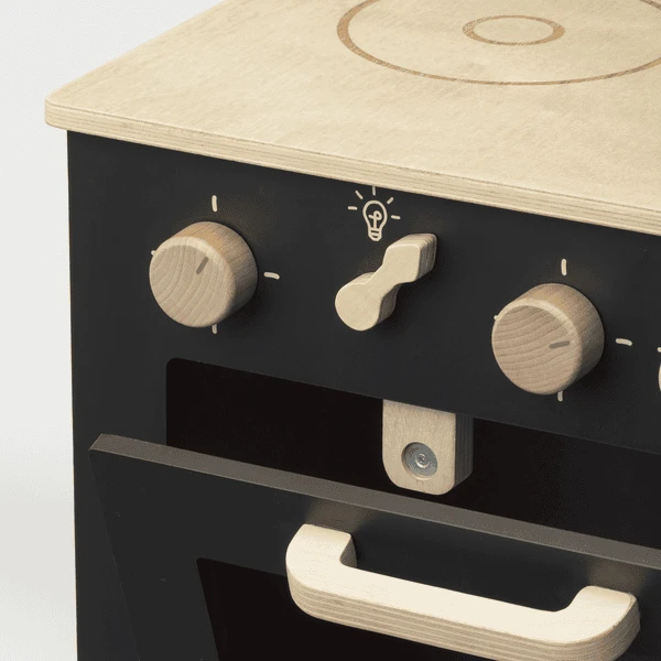 - Het speelgoedfornuis heeft drie platen, de ovendeur gaat open dankzij een draaischarnier en de houten knoppen maken leuke klikgeluiden.